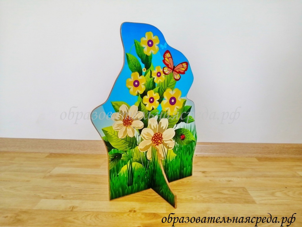 Театральная декорация "Цветы с бабочкой - пень" выполнена из МДФ, с нанесением полноцветного рисунка с двух сторон. Высота декорации 0,65м, ширина - 0,6м. Декорация подойдет в качестве дополнения к любому дереву или теремку, представленному у нас на сайте.