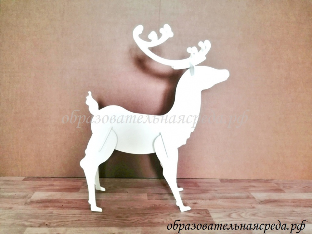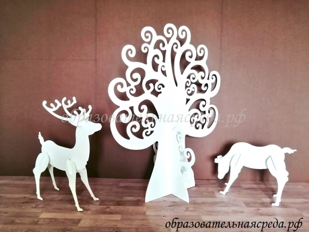 Новогодняя композиция "Лесная сказка" выполнена из МДФ, и окрашенного в белый цвет. Композиция состоит из трех элементов: дерево, олень, олениха. Высота дерева 1,2м, ширина - 1м, высота оленя 0,7м, оленихи - 0,4м. Дерево имеет красивую резную форму с завитками. Композиция порадует детишек не только в новогодние праздники, но и в повседневной жизни. Дерево можно украшать различными тематическими элементами, например гирляндми.