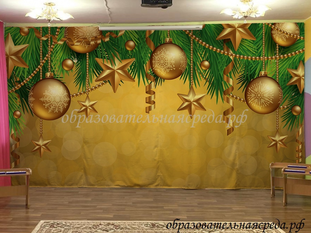 Занавес для сцены "Новогодние шары золото" имеет размер 2,9*5,4м. Занавес оснащен шторной лентой для удобства крепления на гардину.