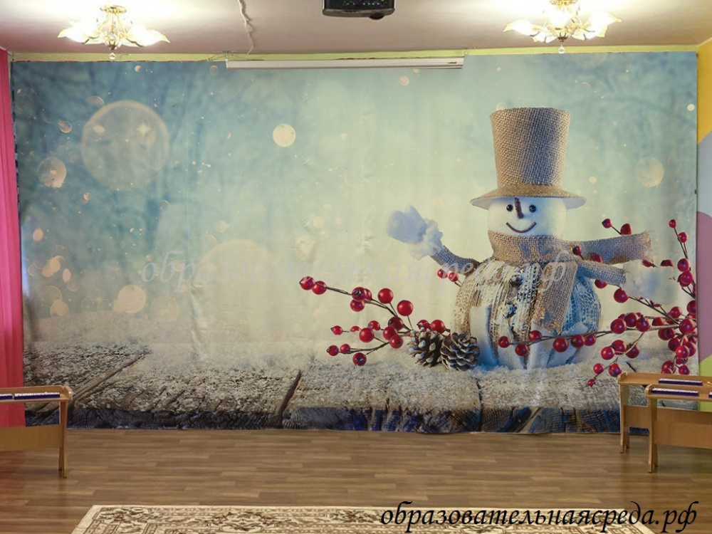 Занавес для сцены "Снеговик в шляпе" имеет размер 2,9*5,4м. Занавес оснащен шторной лентой для удобства крепления на гардину.