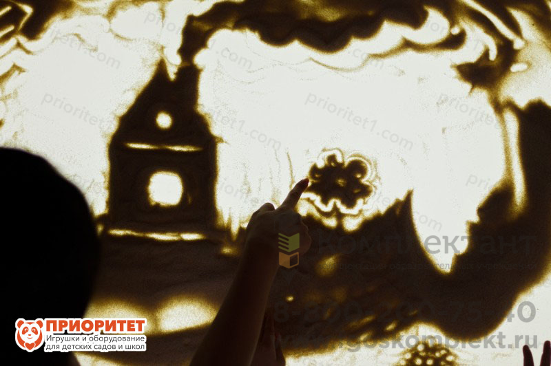 Рисовать на песке ребенок может при помощи каких-либо предметов или же при помощи своих собственных пальчиков. Площадь экрана стола достаточно большая, поэтому малыши могут рисовать группами. Монтаж столика простой, и он не занимает много времени. Надо установить ножки на столешнице и зафиксировать экран вместе с адаптером освещения.