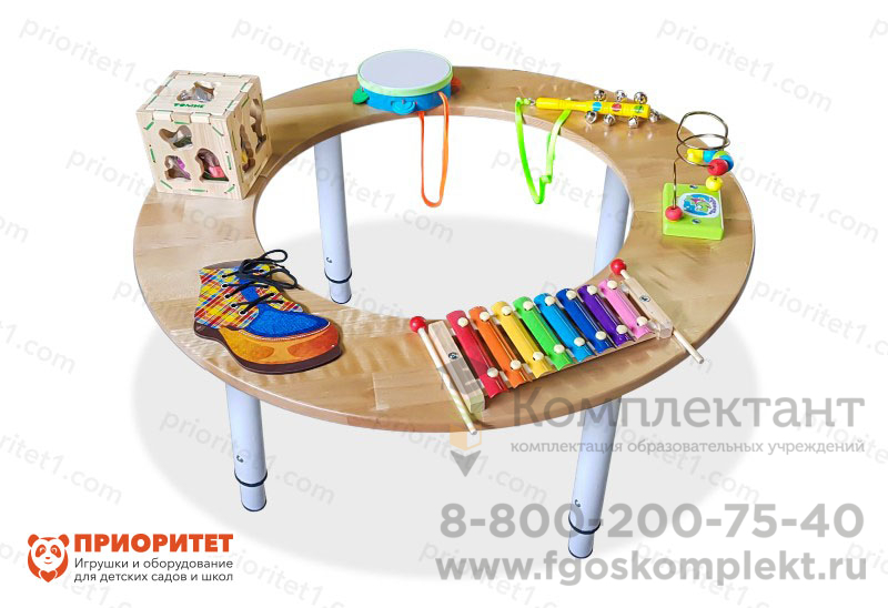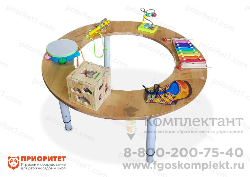 Стол является важным элементом для создания комфортной рабочей обстановки. За столом удобно заниматься музыкальными и тактильными играми. Высота конструкции рассчитана для комфортного поддержания спины. В середине стола имеется отверстие. Стол рекомендован для проведения музыкальных развивающих занятий с малышами в детских садах, игровых и развивающих центрах, реабилитационных и коррекционных учреждениях и т.д.