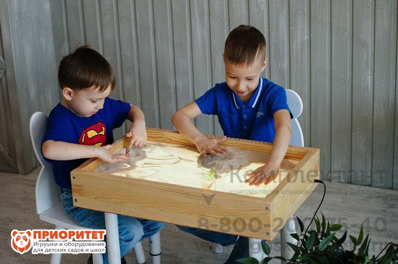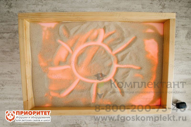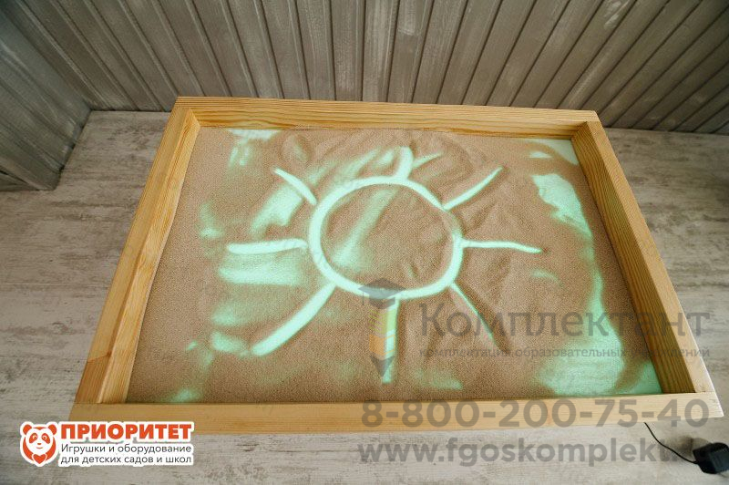 Световой стол выполнен в строгом современном стиле. Здесь отсутствуют отвлекающие элементы. Приятная структура дерева и удобная конструкция стола акцентируют внимание на песочной анимации. Совместный тандем света и песка создают чарующую сказочную атмосферу. Во время занятий пескотерапией под руками ребенка, словно магия, начинают появляться разнообразные рисунки. Оборудование предназначено для коррекционных работ и песочной терапии для психологов и логопедов в детских садах, развлекательных центрах и т.д. Также комплекс можно установить для занятий в домашних условиях.
