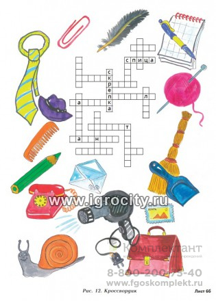 Значимость речи в жизни современного человека трудно переоценить. Вся наша жизнь связана с общением, а средством общения людей является речь. Как правило, наибольших успехов в личной жизни, учебе и работе достигает тот, кто умеет хорошо, красиво и четко говорить, правильно излагая свои мысли. Поэтому если мы думаем о будущем наших детей, то необходимо заниматься развитием речи ребенка с детства. Занятия по развитию речи будут полезны и детям без речевых недостатков, так как высокий уровень речевого развития способствует формированию мышления, памяти, внимания, регуляции поведения, а умение точно и правильно излагать свои мысли — необходимое условие эффективного обучения в школе и успеха в будущей карьере и взрослой жизни. В комплект входят методическое пособие и листы с материалами для занятий. Методическое пособие включает теоретические сведения о развитии речи, практические рекомендации специалистов, увлекательные игры и упражнения, которые помогут развить и обогатить речь ребенка. Комплект предназначен для широкого круга специалистов, работающих с детьми, и всем родителям, вдумчиво относящимся к развитию ребенка. Количество страниц: 80 с. + 22 л. См. Комплект материалов, рис. 12 «Кроссвордик» Взрослому Задача ребенка — разгадать кроссворд, записывая названия изображенных на картинке предметов в соответствующих клеточках. Ответы: скрепка, спица, веник, перо, совок, ручка, портфель, шляпа, галстук, марка, клубок, расческа, конверт, блокнот, карандаш, телефон, улитка, фен. Ребенку «У Ани в комнате ужасный беспорядок. Помоги ей убраться! Разложи все предметы по своим местам. Для этого впиши их названия в соответствующие клеточки на “полках”». Словодел См. Комплект материалов, рис. 21 «Словодел» Взрослому Задача ребенка — придумать как можно больше слов, которые начинаются на заданные слоги. ВЕ, КА, РА, ТЕР (ветер, катер, ракета, территория и т.д.). МА, ША, РЫ, КО, БА (малина, шары, рыба, комар, банан и т.д.). Ребенку «Гном решил сделать Белоснежке подарок ко дню рождения — собрать большой букет цветов. Но для того чтобы сорвать цветы с полянки, нужно составить слова со слогами из цветочных серединок. Помоги гному составить как можно боль-ше слов, которые начинаются с написанных на цветах слогов». Зайка Тим См. Комплект материалов, рис. 33 «Зайка Тим» Взрослому В этом упражнении ребенку нужно расставить слова в правильном порядке, чтобы получились предложения. Задание можно выполнять либо устно, либо письменно — в зависимости от уровня подготовки ребенка. Если ребенку трудно дается выполнение задания, то можно выписать каждое слово предложения на отдельный листочек и разложить листочки перед ребенком, чтобы он мог передвигать слова. Обязательно объясните ребенку значения всех неизвестных ему слов. Ответы (возможны варианты): Дом лесника стоит в лесу среди берез и пушистых елей. Любишь кататься — люби и саночки возить. Бабушка и дедушка живут в деревне на берегу реки возле соснового бора. Мама купила плитку шоколада и коробку конфет. Библиотекарь Нина Михайловна заполняла абонементы и выдавала книги. С деревьев опали осенние листья и накрыли все вокруг, словно разноцветный ковер. Зимой лапы елок покрыты белым инеем, а щеки и носы щиплет мороз. На уроке Максим старался правильно читать и учился красиво выводить буквы. В праздник на улицах 