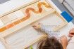 - Дорожки. (упражнение способствует в развитии мелкой моторики). В модуле для рисования песком педагог предлагает ребенку проложить «Дорожки к домику ежика». Сначала следует начать с простых линий, затем перейти к ломаным, прерывистым, различным по интенсивности и напряженности.