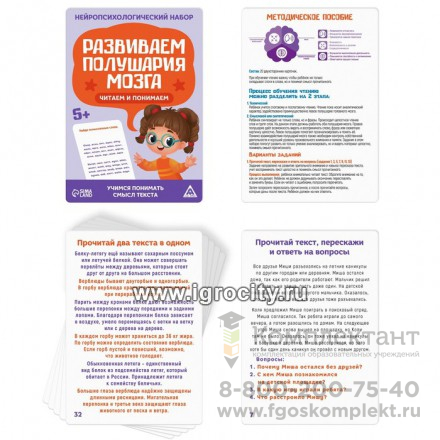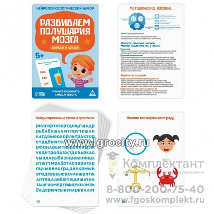 Перед вами набор, в котором собран комплекс заданий и упражнений, направленный на развитие обоих полушарий мозга. Занимаясь, ребёнок разовьёт речь и навыки чтения. В каждой игре его ждёт 20 карточек с заданиями и подробное методическое пособие. Как играть? Все задания выполняются под наблюдением взрослого. Рекомендуем начать занятия с просто материала — «Составляем рассказы по картинкам». После можно постепенно переходить к обучению чтению. Благодаря набору ребёнок научится: составлять рассказы по картинкам; читать текст, пересказывать и отвечать на вопросы; читать текст и выбирать картинку, которая ему соответствует; читать 2 текста одновременно; вставлять пропущенные окончания и слоги в словах; выполнять прочие задания.