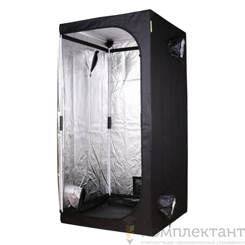 Гроутент на 2–4 растения. Сборно-разборный каркас из металлических трубок и жёстких пластиковых уголков, на который надевается «палатка»; тент прочный, устойчивый, его очень легко собрать (есть инструкция, как у икеи). Две перекладины для подвесного оборудования, собранный гроубокс выдерживает до 36 кг. Пять монтажных рукавов (Ø 15 см) + рукав поменьше для кабелей (Ø 9 см). Дверь на молнии открывается с двух стенок. Смотровое окошко с прозрачной плёнкой на передней стенке, вентиляционное с сеткой — на задней; оба окошка можно заклеить шторками на липучке. Также в комплект входит карман для инструментов на регулируемых ремешках и мягкий водонепроницаемый поддон на пол.