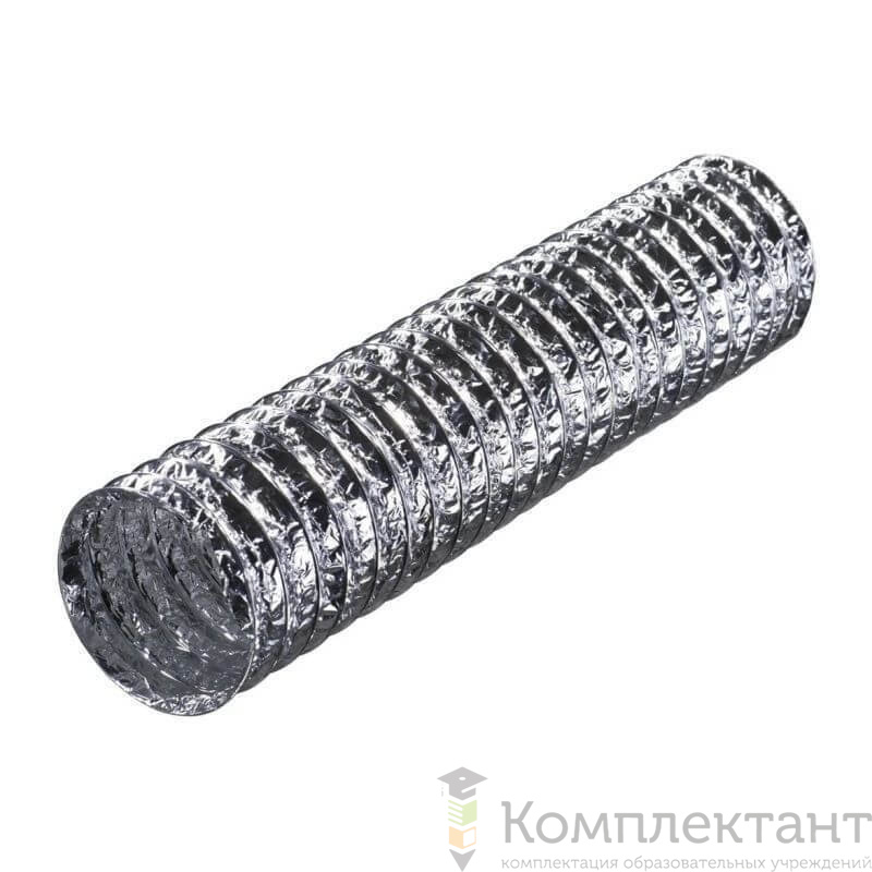 Гибкий, прочный воздуховод: пять ламинированных слоёв алюминиевой фольги и ПВХ с витками прочной стальной проволоки между слоями.