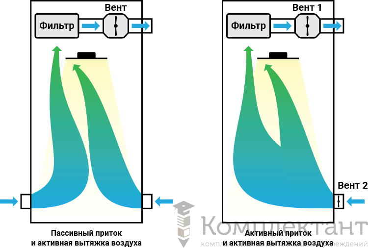Если ваш тент установлен в помещении с повышенной влажностью (в гараже, например) или используется освещение с большой теплоотдачей (например, ДНаТ), мы рекомендуем организовать активный приток свежего воздуха с помощью приточного вентилятора. На рисунке схема гроубокса с пассивной и активной приточной вентиляцией.