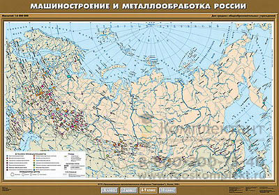 Масштаб 1:6000000, формат 140*100 см. Кругами на карте изображаются промышленные центры: крупнейшие, крупные, средние, прочие. Цветным фоном внутри них – отрасли машиностроения и металлообработки. Односторонняя печать, двустороннее ламинирование, лицевая сторона покрыта матовым ламинатом.