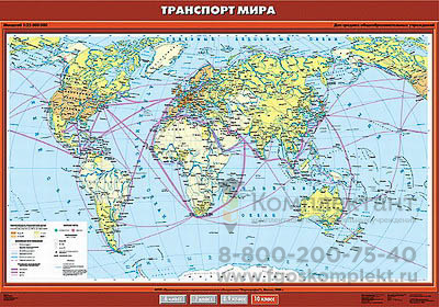 Масштаб 1:25000000, формат 140*100 см. Фоном на карте показана обеспеченность транспортной сетью, кругами зеленого и красного цветов – морские порты (универсальные и нефтяные). Размер круга соответствует грузообороту морского порта. Фиолетовые линии показывают основные направления морских перевозок с подразделением крупнейшие, крупные, прочие. Штриховыми знаками даются железные дороги, автомобильные дороги, внутренние водные пути, крупнейшие международные аэропорты. Односторонняя печать, двустороннее ламинирование, лицевая сторона покрыта матовым ламинатом.