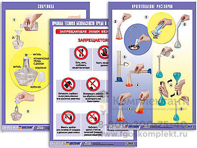 2. Инструктивные таблицы: "Спиртовка", "Электронагреватели", "Приемы обращения с лабораторным штативом", "Обращение с твердыми веществами", "Обращение с жидкими веществами", "Нагревание", "Получение и собирание газов". "Взвешивание", "Приготовление растворов", "Фильтрование", "Перегонка", "Титрование".