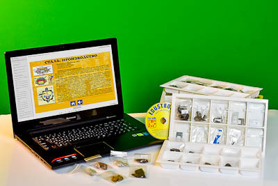 Образцы пронумерованы и упакованы в коробку с ячейками. Комплектуются ламинированными вкладышами со схемами производства чугуна и стали.