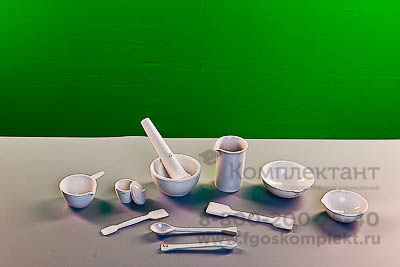 Комплектность: кастрюля с ручкой №1 – 1 шт., ложка №1 – 1 шт., ложка №2 – 1 шт., пест №3 – 1 шт., стакан №3 – 1 шт., Ступка №3 – 1 шт., тигель №3 – 1 шт., крышка к тиглю №3 – 1 шт., чашка выпарительная №2 – 1 шт., чашка выпарительная №3 – 1 шт., шпатель № 1 – 1 шт., шпатель № 2 – 1 шт. Изготовлены из фарфора.