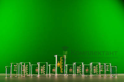 Комплектность: стакан 50 мл с делениями – 2 шт., стакан 100 мл с делениями - 4 шт., стакан 150 мл – 4 шт., стакан 250 мл с делениями – 4 шт., стакан 600 мл с делениями – 1 шт. Изготовлены из стекла.