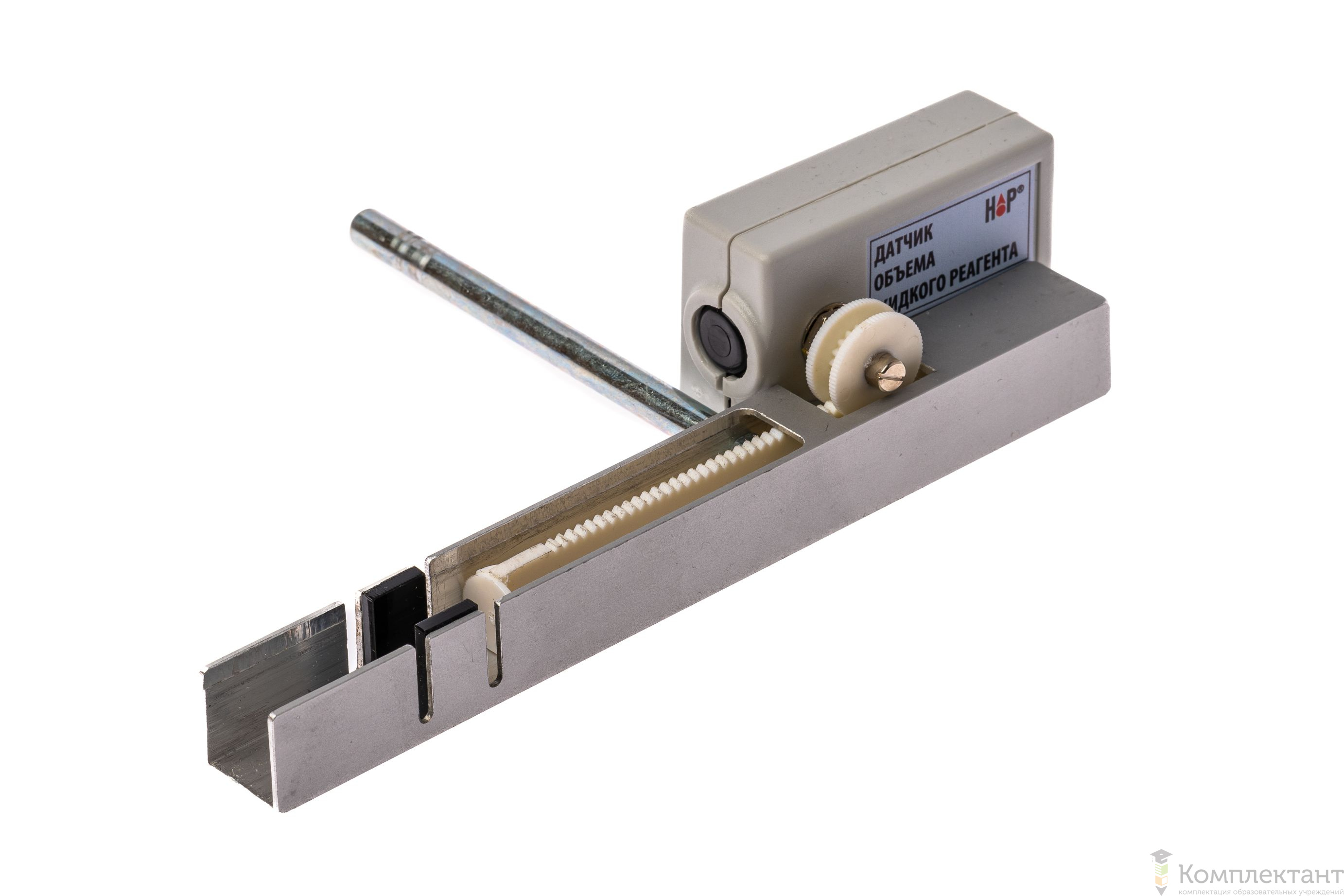 Датчик объема жидкого реагента состоит из корпуса электронного блока, толкателя на основе реечного механизма и цифрового датчика, контролирующего вращение рукоятки.