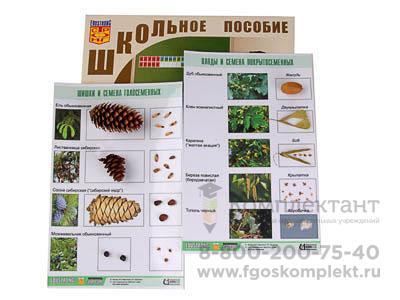 В коллекции представлены шишки, плоды и семена хвойных и покрытосеменных растений. Натуральные образцы сопровождаются фотографиями растений. Планшеты формата А4 изготовлены из картона и ламинированы глянцевой пленкой.