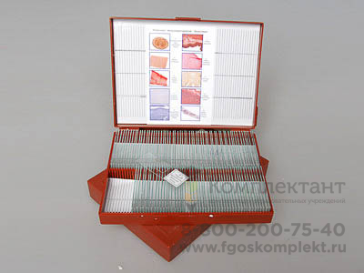 Предназначен для проведения широкого спектра лабораторных работ, направленных на изучение биологических объектов на клеточном и гистологическом уровнях. Снабжен экспликацией на русском и английском языках. При необходимости препараты окрашены, что делает их детали более контрастными. Комплект содержит методические рекомендации по проведению лабораторных работ, снабженные иллюстрациями, на которых показано, какие детали препарата можно рассмотреть и какое увеличение рекомендуется для этого использовать.
