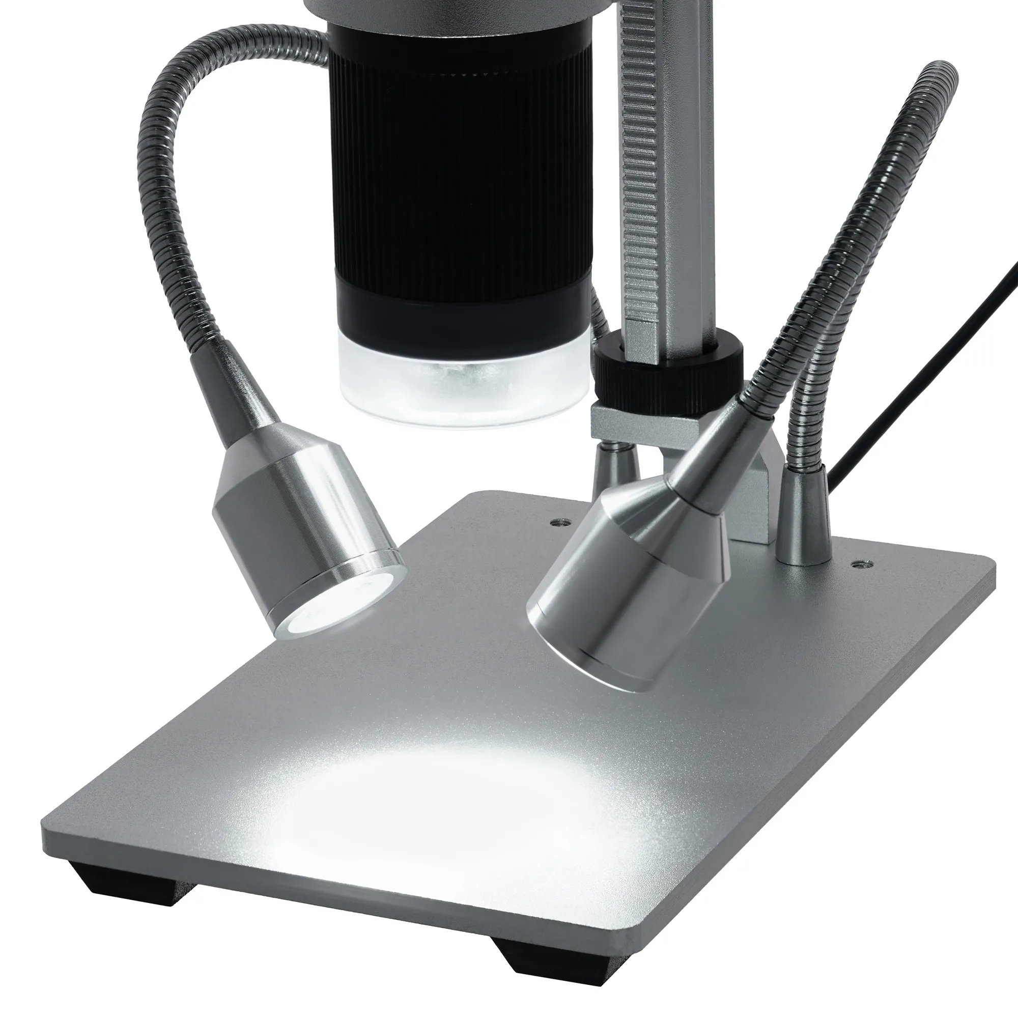 Подсветка предметного столика реализована очень интересно. Во-первых, есть светодиоды внутри объектива. Во-вторых, две лампочки закреплены на гибких держателях, которые можно поворачивать под разными углами. Такое сочетание источников освещения позволяет выставлять свет максимально точно и удобно для наблюдений. Яркость подсветки можно регулировать.