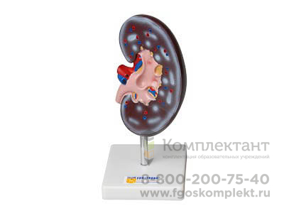 Модель демонстрирует внешнее строение почки человека и ее сагиттальный разрез. Модель окрашена в естественные цвета. На модели представлены следующие элементы строения почки человека: 1. Капсула почки. 2. Корковый слой почки. 3. Большая почечная чашечка. 4. Мозговое вещество (пирамиды). 5. Мочеточник. 6. Почечная лоханка. 7. Почечная вена. 8. Почечная артерия.