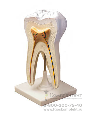 На модели представлены следующие детали строения: коронка зуба, шейка зуба, корень зуба, зубная эмаль, зубная кость (дентин), зубная пульпа, нервы и кровеносные сосуды.