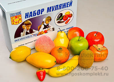 Состав набора (муляжи): 1. Яблоко зеленое. 2. Яблоко красное. 3. Киви. 4. Гранат. 5. Персик. 6. Лимон. 7. Груша. 8. Апельсин. 9. Манго. 10. Хурма. 11. Банан. 12. Клубника.