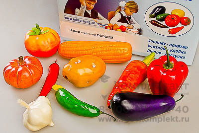 Состав набора (муляжи): 1. Баклажан. 2. Перец стручковый. 3. Кукуруза. 4. Морковь. 5. Огурец. 6. Перец болгарский. 7. Помидор. 8. Тыква круглая. 9. Чеснок. 10. Картофель.