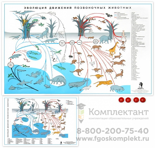 Таблица «Эволюция движения позвоночных животных» предназначена для использования в общеобразовательных учреждениях при изучении тем «Эволюционное учение», «Развитие органического мира», «Происхождение человека», «Основные направления эволюции органического мира» в разделе «Общая биология». Может использоваться также в преподавании раздела «Животные» и интегрированного курса «Естествознание». Таблицу используют для демонстрации при объяснении нового материала, а также для контроля знаний обучающихся. Таблицы выполнены на мелованной бумаге (плотность 150г/м2) с нанесенным типографским способом цветным рисунком. Таблицы покрыты защитным слоем матового ламината.Комплектность: Демонстрационная таблица (размер – 60 х 90 см) – 1шт.; Раздаточные карточки (размер – 30 х 45 см) – 15 шт.; Магнит для крепления демонстрационной таблицы – 4 шт.; Руководство по использованию, паспорт – 1 шт.; Коробка упаковочная – 1 шт.'> Таблица «Эволюция движения позвоночных животных» предназначена для использования в общеобразовательных учреждениях при изучении тем «Эволюционное учение», «Развитие органического мира», «Происхождение человека», «Основные направления эволюции органического мира» в разделе «Общая биология». Может использоваться также в преподавании раздела «Животные» и интегрированного курса «Естествознание». Таблицу используют для демонстрации при объяснении нового материала, а также для контроля знаний обучающихся. Таблицы выполнены на мелованной бумаге (плотность 150г/м2) с нанесенным типографским способом цветным рисунком. Таблицы покрыты защитным слоем матового ламината.Комплектность: Демонстрационная таблица (размер – 60 х 90 см) – 1шт.; Раздаточные карточки (размер – 30 х 45 см) – 15 шт.; Магнит для крепления демонстрационной таблицы – 4 шт.; Руководство по использованию, паспорт – 1 шт.; Коробка упаковочная – 1 шт.