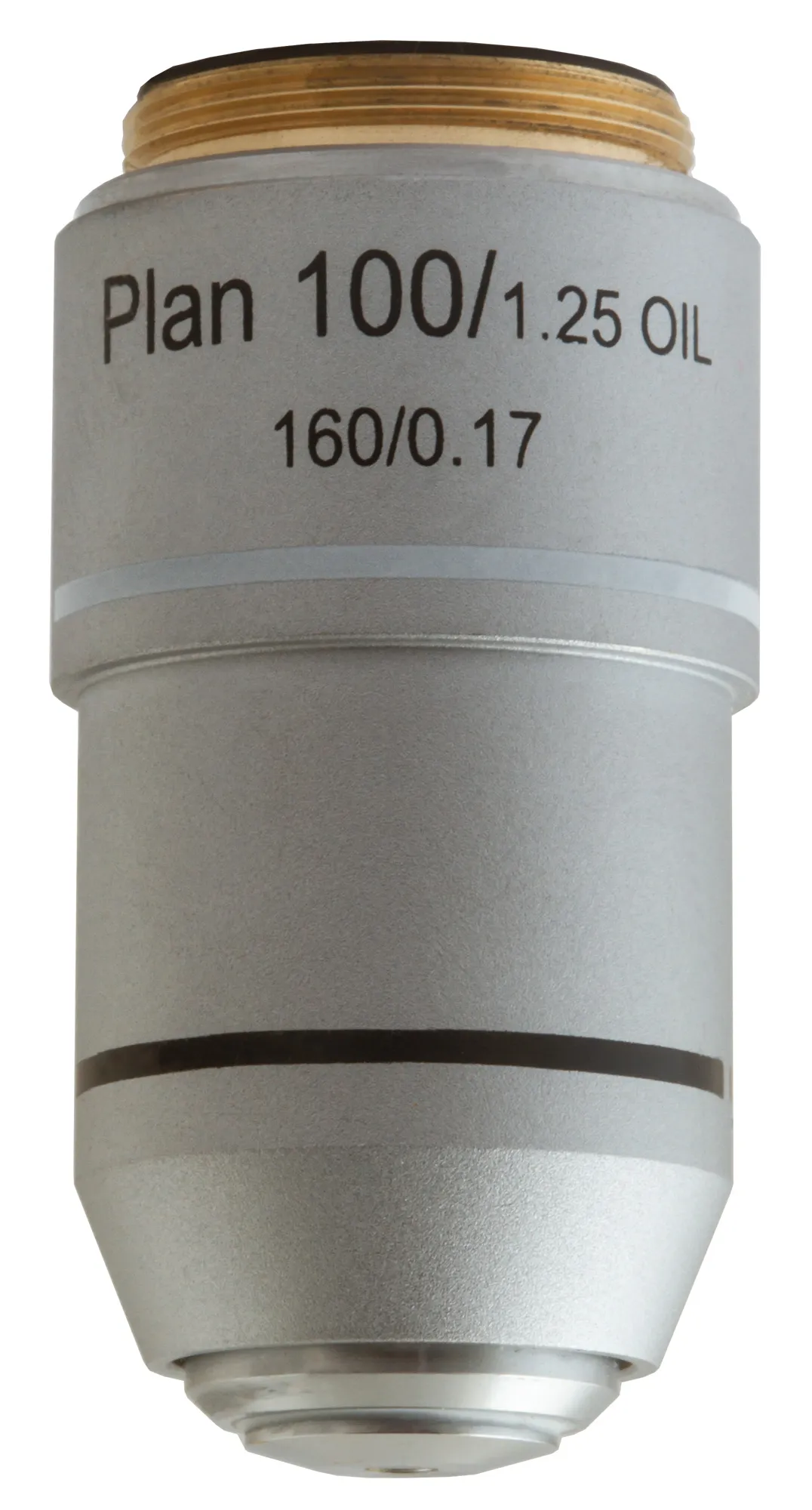 Планахроматический объектив Levenhuk MED 100x можно использовать для «сухих» наблюдений и исследований с применением масляной иммерсии. Рабочее расстояние объектива небольшое, поэтому передняя линза защищена пружинящей оправой, что исключает ее случайное повреждение. Планахроматическая оптика улучшает детализацию передаваемой картинки, так как убирает сферические аберрации. Поле зрения выровнено практически полностью, улучшена цветопередача.