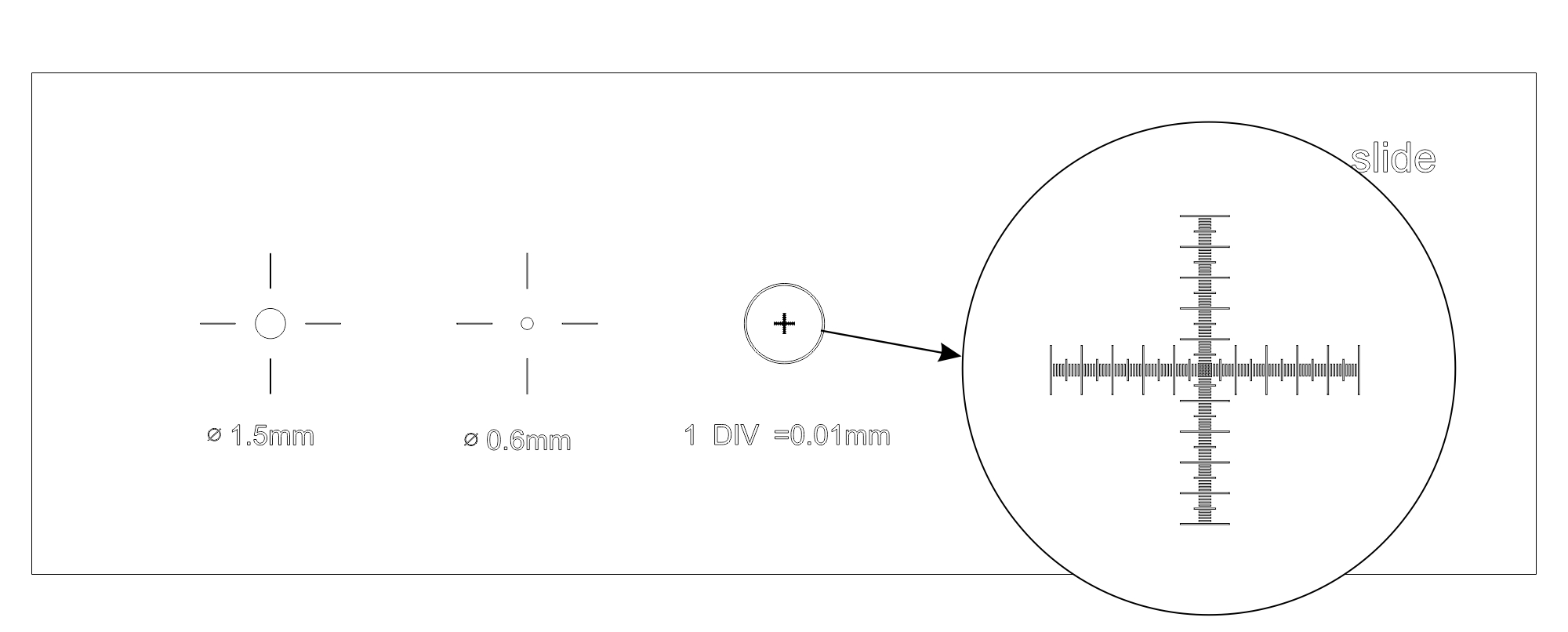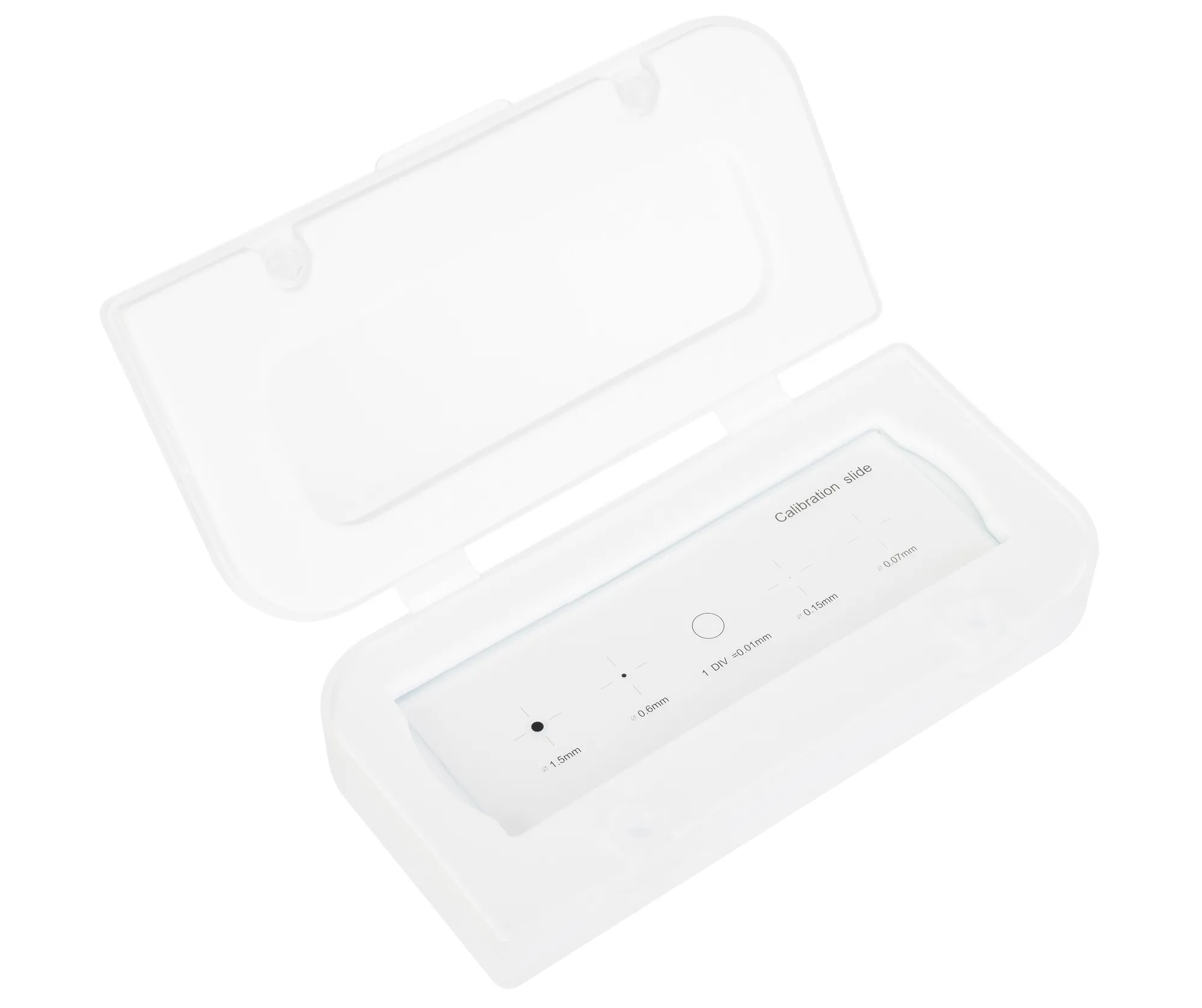 Калибровочный слайд Levenhuk 2 имеет стандартные размеры – как у предметного стекла. Калибровку следует выполнять для каждого объектива в отдельности, полученный поправочный коэффициент позволит проводить точные измерения в выбранных единицах.