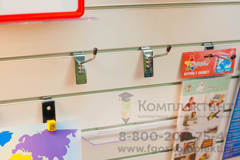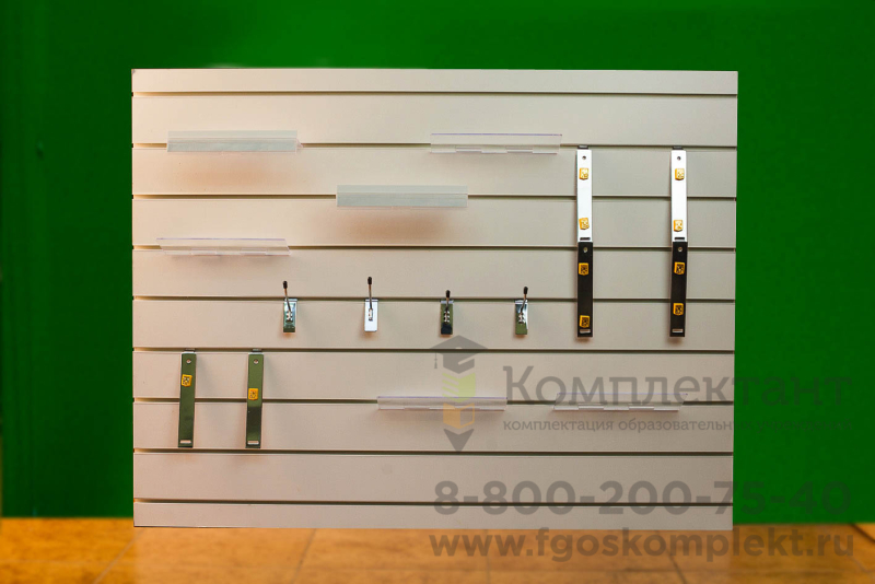 Стенд представляет собой ламинированный щит с пазами для крепления аксессуаров: набора полок, крюков, магнитных держателей и подвесок. Аксессуары вставляются в пазы щита и размещаются на стенде в удобном для экспозиции месте.