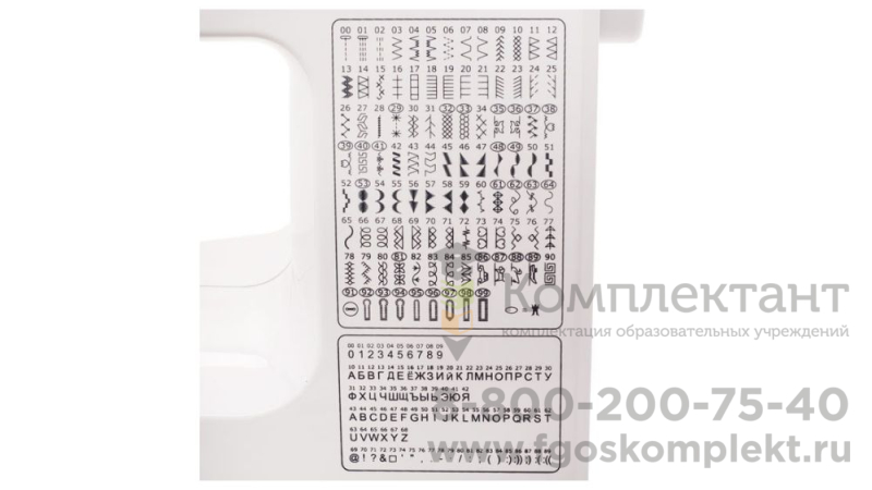 алфавиты, декоративные строчки, зигзаг, оверлочная, отделка фестоном, потайная строчка, прямая строчка (левое положение иглы), прямая строчка (центральное положение иглы), трикотажные строчки, трикотажный зигзаг, штопка, эластичный зигзаг