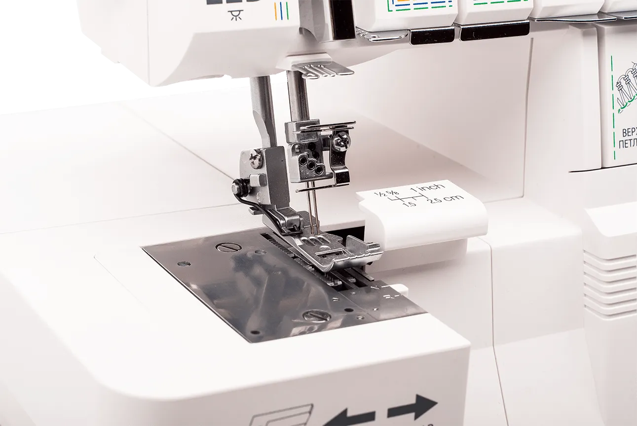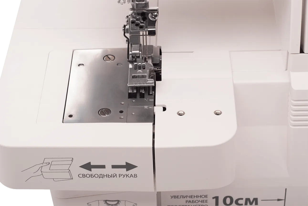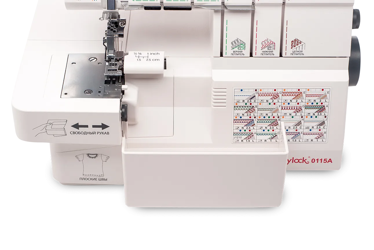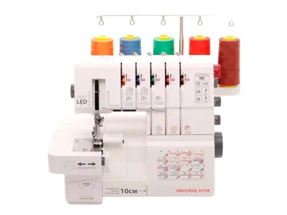 Модель Merrylock 0115А – это новый пятиниточный коверлок с автоматическим натяжением нитей. Главные отличия новой модели: свободный рукав. Свободный рукав позволяет обрабатывать рукава, низ штанин и других труднодоступных цилиндрических изделий. Светодиодная LED подсветка обеспечивает 10 000 часов работы без смены лампы. Расширенная рабочая поверхность - от иглы до станины 10 см.