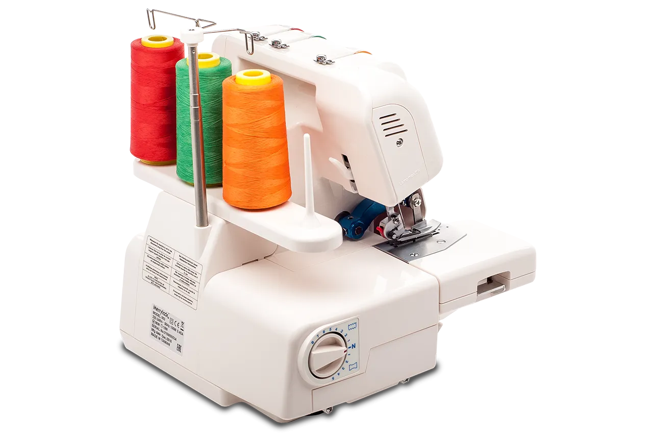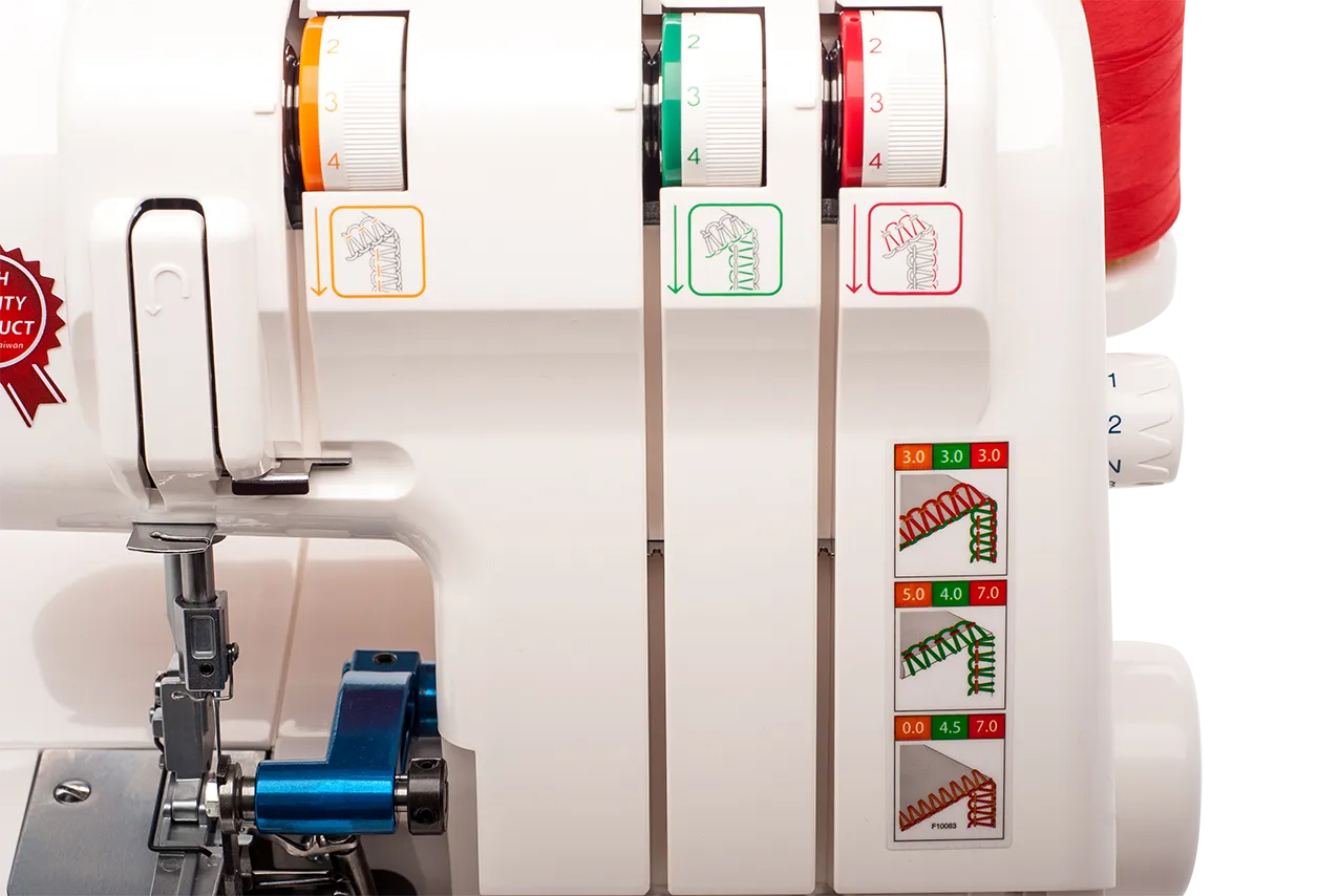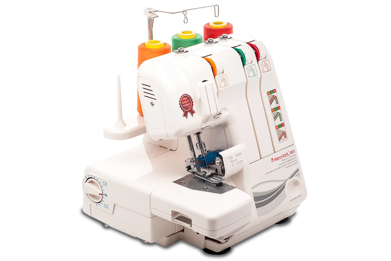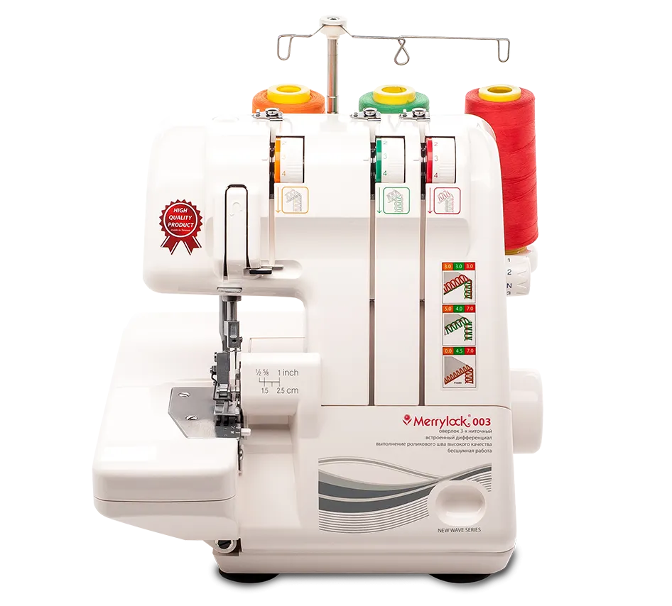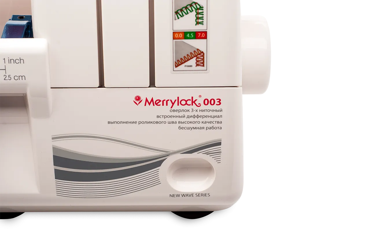 Трёхниточный оверлок Merrylock 003 с удобной системой регулировки натяжения нити обеспечивает ровные и красивые швы. А встроенный палец ролевого шва позволяет без смены игольной пластины выполнять как обычные строчки, так и ролевый шов. Разобраться в них Вам не составит труда с цветной схемой швов, расположенной на корпусе.