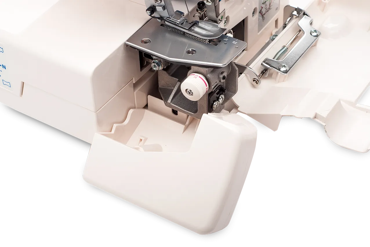 В комплектации оверлока предусмотрен рабочий столик, опускающийся нажатием на рычаг, встроенная коробка для хранения швейных мелочей, мусоросборник. А с встроенным освещением Ваша рабочая область всегда будет хорошо просматриваться.