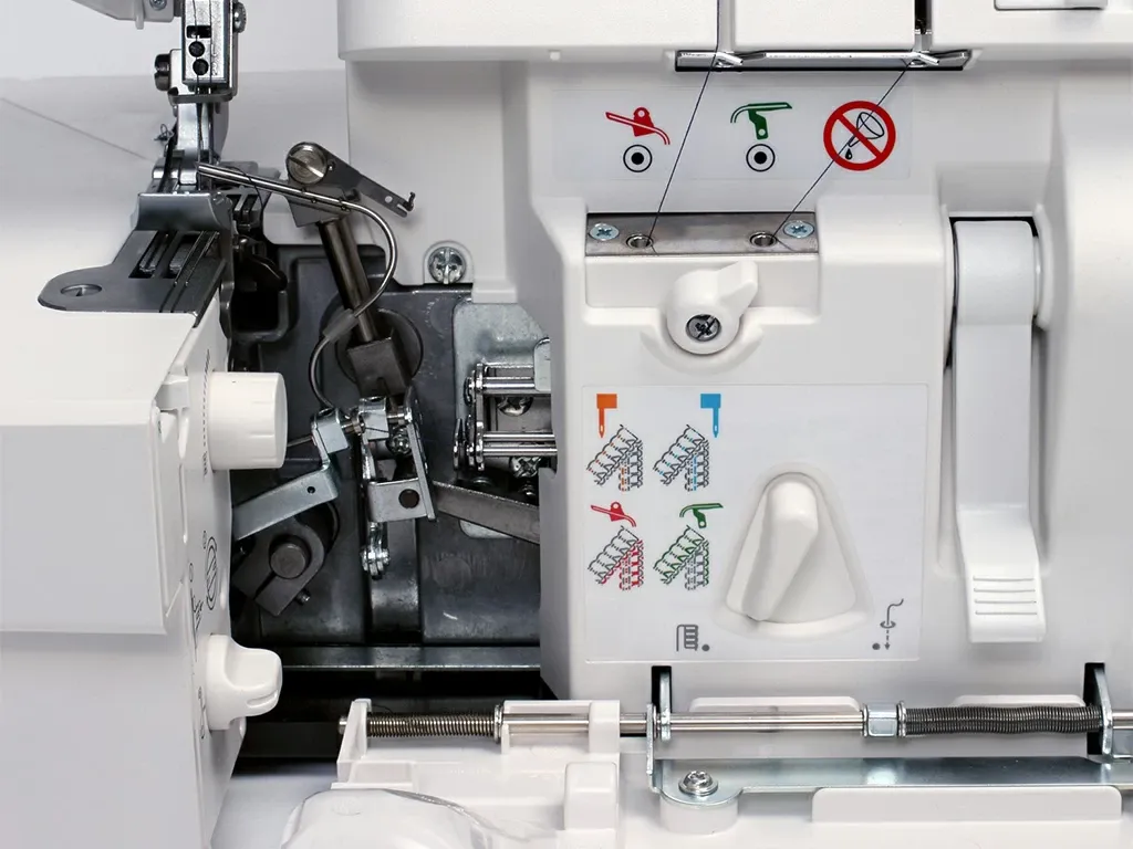 В комплекте вы найдете специальный лоток для обрезков, который поможет сохранить ваше рабочее место в чистоте. С помощью специального переключателя, позволяющего выполнить предварительную настройку натяжения нити петлителя, можно быстро перейти к шитью ролевым швом. Также здесь реализован встроенный конвертер для шитья в режиме 2-х ниточного шва.
