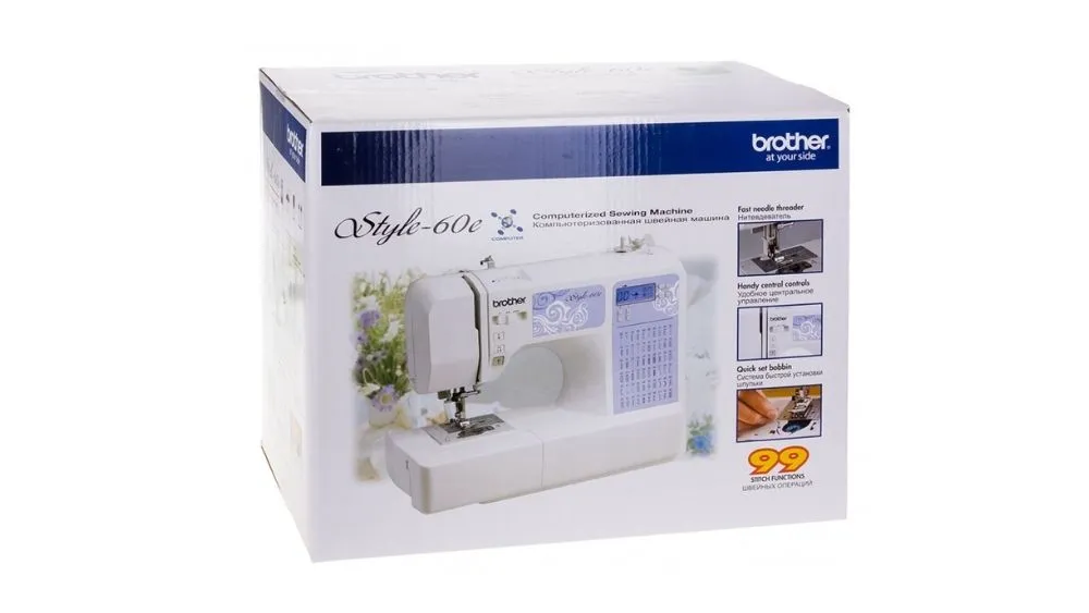 Brother Style 60E имеет в своём наборе 60 встроенных операций, в том числе выполнение петли в автоматическом режиме. Выбор типа шитья осуществляется с помощью кнопок меню расположенных на передней части корпуса рядом с монохромным дисплеем, отображающим текущие настройки. Для большего удобства при работе в конструкции предусмотрен специальный отсек для хранения аксессуаров и принадлежностей.
