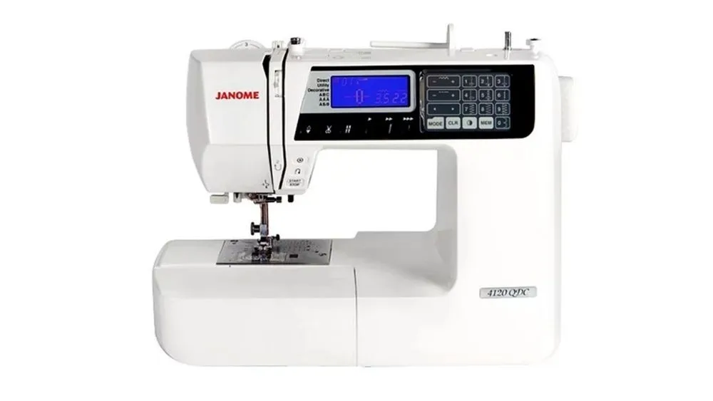 Модель Janome 4120 QDC характеризуется наличием светодиодной подсветки рабочей поверхности, функцией автоматической закрепки, регулятором скорости шитья и наличием возможности осуществлять шитьё без применения педали. Также швейная машина обладает удобным коленным рычагом и жидкокристаллическим дисплеем, отображающим актуальную для швейного процесса информацию (требуемый тип лапки, длина стежка, тип строчки).