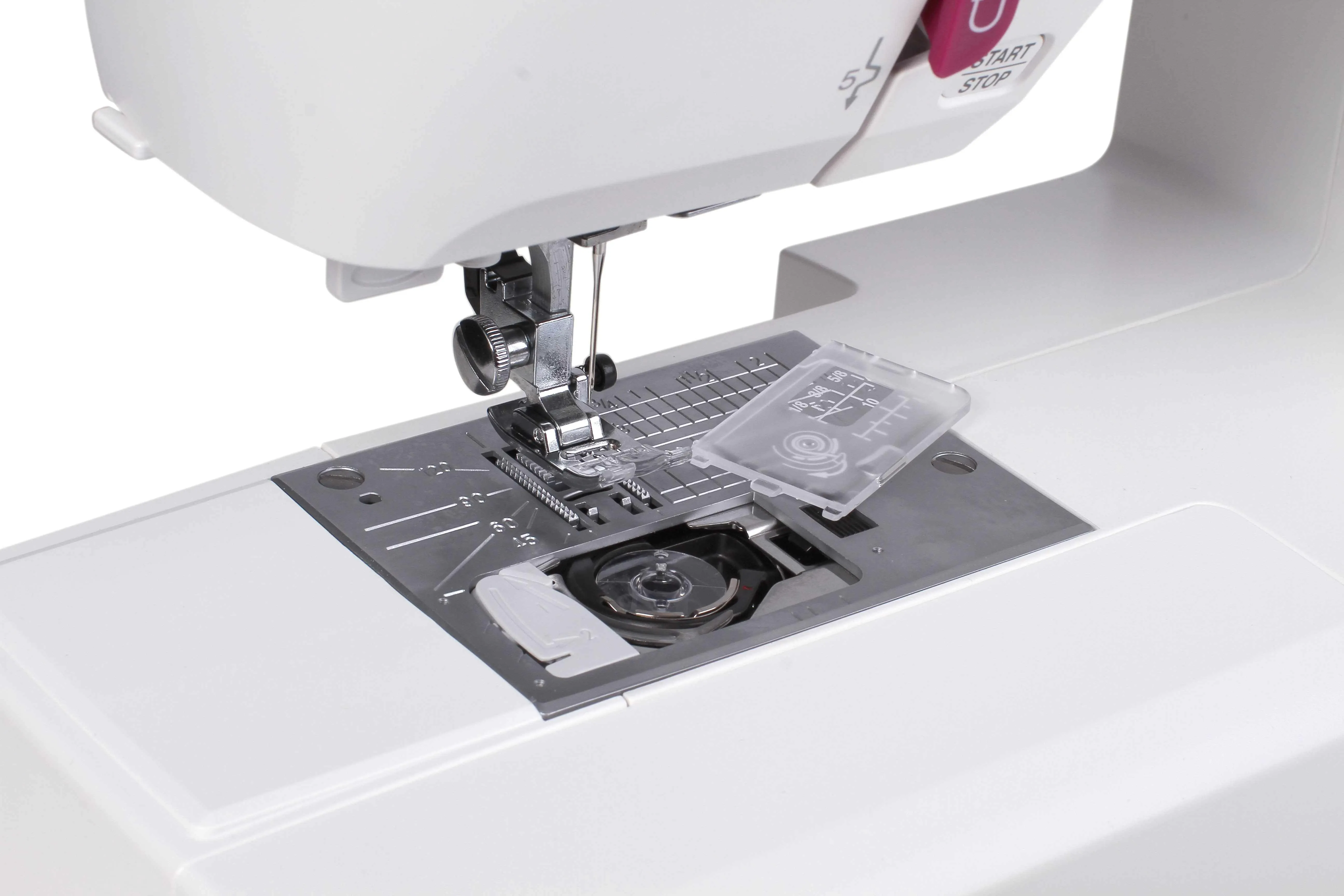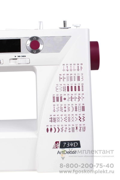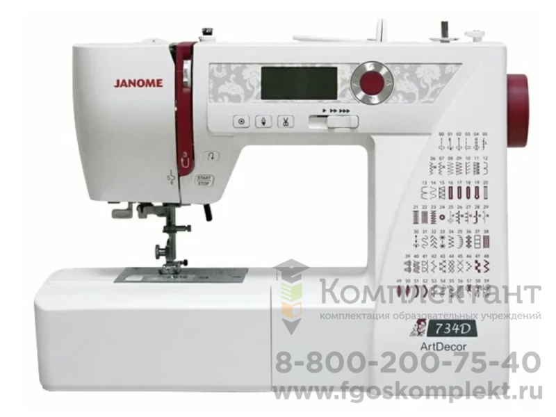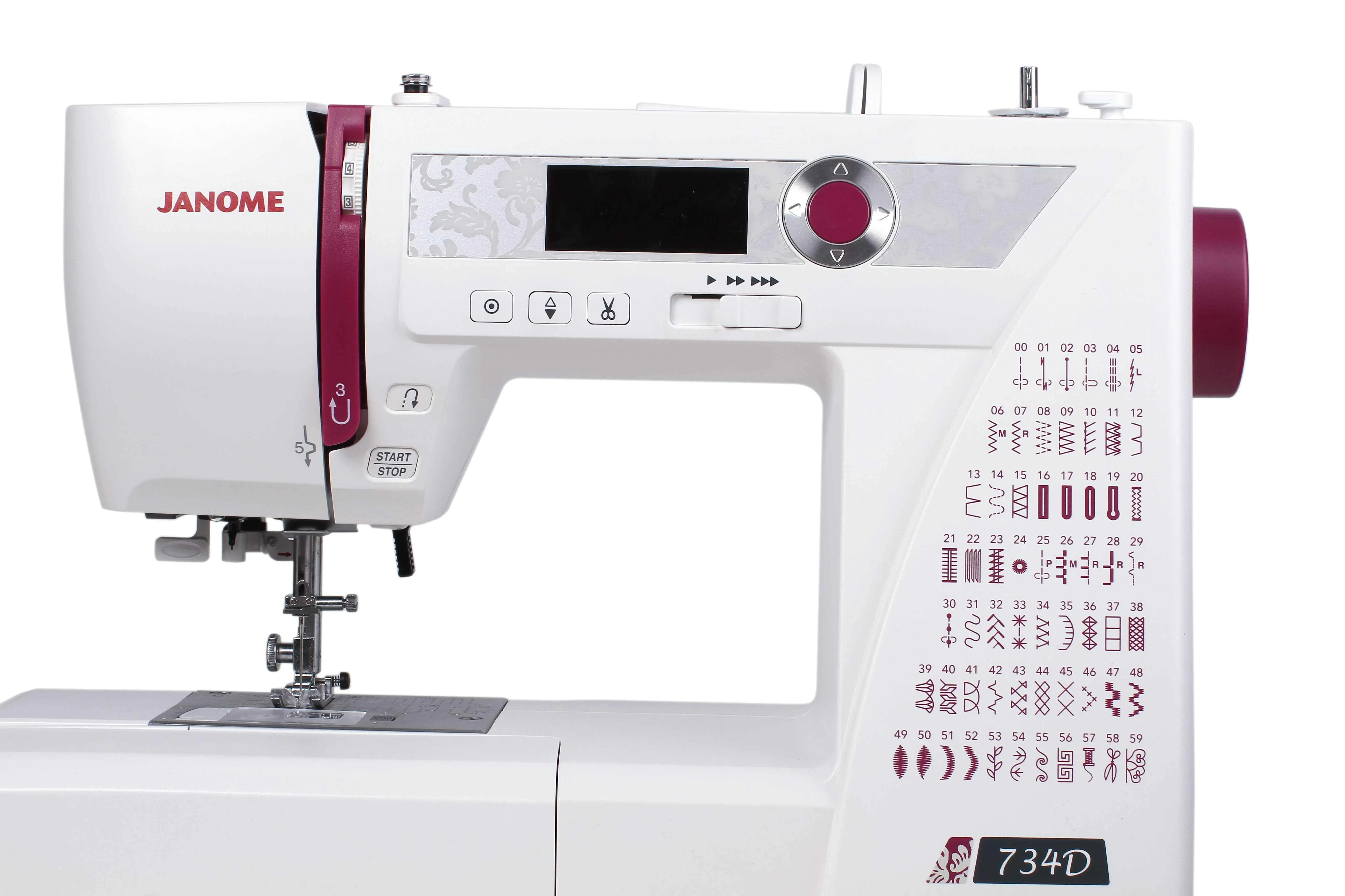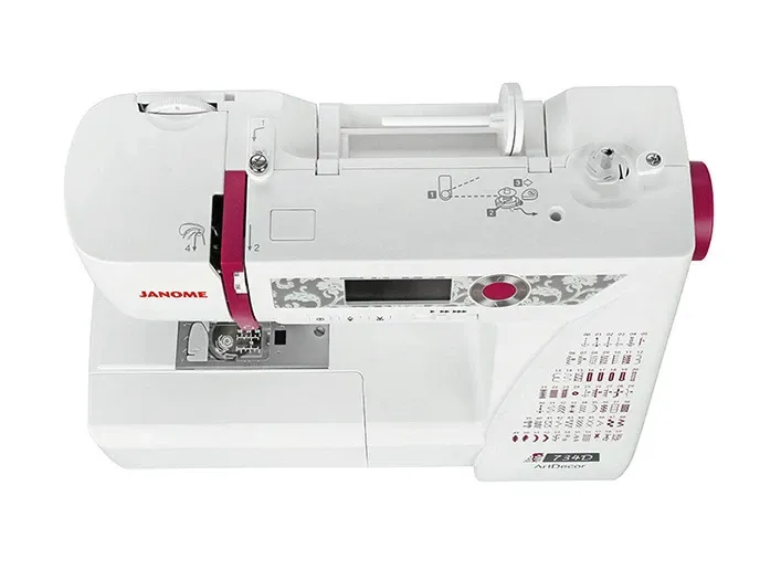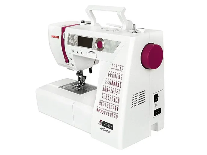 представляет собой новейший образец компьютеризированной швейной техники от известного японского бренда. Обладая этой швейной машиной, можно смело браться за сложные выкройки и объемные проекты – разнообразия функций достаточно как для пошива, так и для дизайна изделий. Упор сделан на квилтинговые и декоративные строчки, есть большой набор швов для трикотажных тканей. И, конечно, подобраны самые распространенные рабочие и обметочные строчки. Навигация по функциям проста – передняя панель отображает перечень выполняемых операций, выбирать которые можно с помощь селектора в виде джойстика. Цифровой жидкокристаллический дисплей отображает текущие настройки и параметры шитья.Скорость шитья в Janome ArtDecor 734D можно регулировать как с помощью педали, так и трёхступенчатым переключателем на приборной панели. Скорость варьируется в широких пределах, а максимальная составляет 820 стежков в минуту. Благодаря горизонтальному ротационному челноку, даже при таком темпе швейная машинка Janome ArtDecor 734D работает тихо, сохраняя ровный, размеренный ход. В наличии все стандартные опции для модели такого уровня: автоматическая точечная закрепка, стабилизатор усилия прокола, возможность использования двойной иглы, автообрезка нитей, остановка иглы в верхнем положении, а также горизонтальный и вертикальный позиционер. На металлической станине имеются линии-подсказки, а прямо под рукой расположена кнопка баланса строчки.