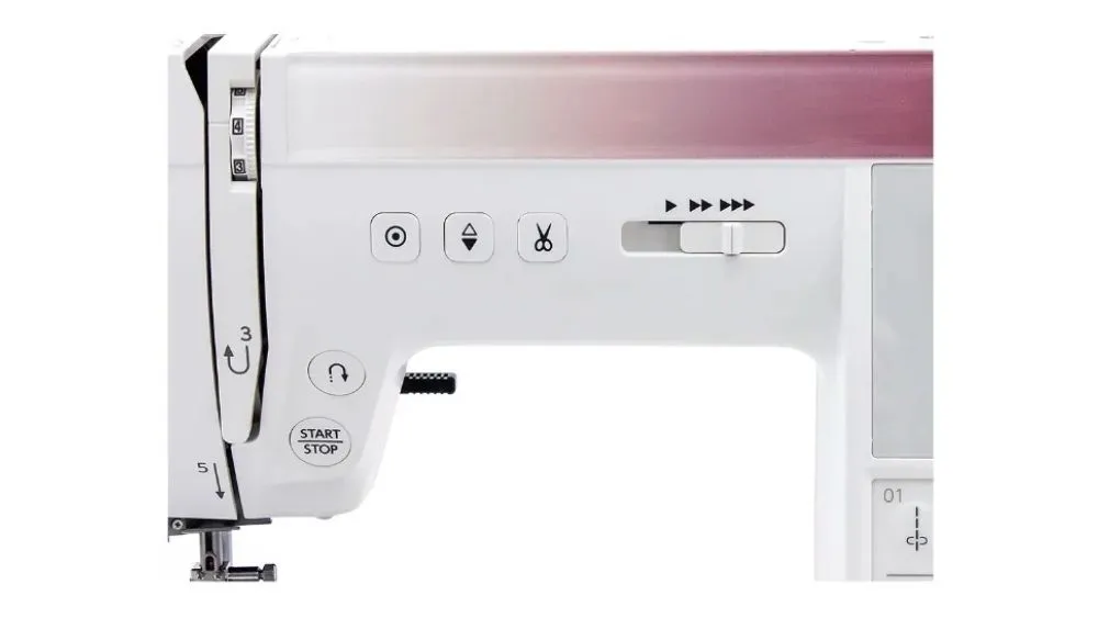 На встроенном в швейную машину Janome Sewist 740DC ЖК-дисплее показывается данные о выборе режима шитья: вид строчки, длина стежка, ширина строчки и какую лапку нужно взять для выполнения задуманного. Выметывание 3-х видов петель производится автоматически. В рабочей зоне есть светодиодная подсветка.