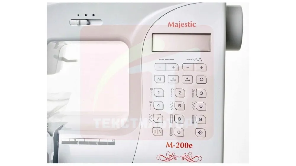 Juki Majestic M-200e имеет в своём наборе 197 различных швейных программ, в том числе и 1 алфавит. Выбор режима шитья осуществляется с помощью кнопок меню, расположенных на передней части корпуса рядом с монохромным дисплеем, отображающим заданные настройки. Выполнение петли происходит в автоматическом режиме. Встроенный нитевдеватель упрощает процесс заправки нити, делая его быстрым и комфортным. Кнопка реверса обеспечивает обратный ход прошиваемого материала.