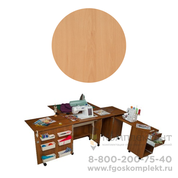 Удобный легко трансформируемый швейный центр, который позволяет организовать рабочее место швеи. В столе предусмотрено место для хранения и использования швейной машины и оверлока, а также имеется дополнительная поверхность для раскроя ткани.