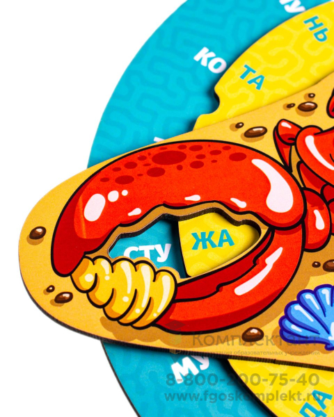Игра состоит из двух кругов разного диаметра и краба с отверстием в клешне. Каждый круг подвижен и разделен на сектора со слогами. Задача ребенка соединить слога на кругах так, чтобы получилось несколько вариантов слов для каждого слога. Развивает навыки чтения, внимание, память и мышление.