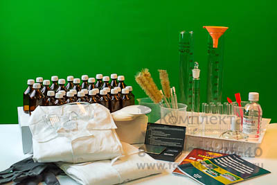 Комплектность: весы лабораторные электронные до 200 г – 1 шт., спиртовка лабораторная – 1 шт., воронка коническая – 1 шт., палочка стеклянная – 1 шт., пробирки ПХ-14 – 10 шт., стаканы высокие с носиком ВН-50 мл с меткой – 2 шт., цилиндр измерительный 50 мл стеклянный, с притертой крышкой – 1 шт., штатив (подставка) для пробирок на 10 гнезд – 1 шт., зажим пробирочный – 1 шт., ложки-шпатели – 3 шт., набор флаконов для хранения растворов и реактивов (флаконы темного стекла 100 мл с пробкой и крышкой – 30 шт. (5 комплектов по 6 шт.), флаконы темного стекла 30 мл с пробкой и крышкой – 60 шт. (10 комплектов по 6 шт.)), цилиндры измерительные с носиком 500 мл – 2 шт., стаканы высокие 500 мл – 3 шт., набор ершей для мытья посуды (ерши для мытья пробирок – 3 шт., ерши для мытья колб – 3 шт.), халаты белые х/б – 2 шт., перчатки резиновые химически-стойкие – 2 пары, защитные очки – 1 шт., фильтры бумажные Ø 9 см (100 шт.) – 1 уп.,горючее для спиртовок (0,33 л) – 1 уп., раздаточный лоток – 1 шт., учебное пособие "Нормативно-методическое руководство по безопасному использованию оборудования и реактивов при проведении ГИА по химии" (автор Т.С. Назарова – брошюра, 40 страниц – печать офсетная, обложка полноцветная) – 1 шт., учебное пособие "Лабораторные опыты по курсу химии" (автор Л. Е. Богданова - брошюра, 56 страниц - печать офсетная, обложка полноцветная) – 1 шт., руководство по эксплуатации – 1 шт., реактивы (44 различных веществ, используемых для составления комплектов реактивов при проведении экзаменационных экспериментов по курсу школьной химии): алюминий (гранулы) – 10 г, железо (стружка) – 20 г, цинк (гранулы) – 20 г, медь (проволока) – 10 г, оксид меди II (порошок) – 10 г, оксид магния (порошок) – 10 г, оксид алюминия (порошок) – 10 г, оксид кремния (порошок) – 10 г, соляная кислота (раствор 14 %) – 50 г, серная кислота (раствор 44 %) – 50 г, гидроксид натрия (для приготовления раствора) – 15 г, гидроксид кальция (для приготовления раствора) – 25 г, хлорид натрия (для приготовления раствора) – 5 г, хлорид лития (для приготовления раствора) – 5 г, хлорид кальция (для приготовления раствора) – 5 г, хлорид меди II (для приготовления раствора) – 5 г, хлорид алюминия (для приготовления раствора) – 10 г, хлорид железа III (для приготовления раствора) – 5 г, хлорид аммония (для приготовления раствора) – 5 г, хлорид бария (для приготовления раствора) – 5 г, сульфат натрия (для приготовления раствора) – 5 г, сульфат магния (для приготовления раствора) – 5 г, сульфат меди II (для приготовления раствора) – 5 г, сульфат железа II (для приготовления раствора) – 5 г, сульфат цинка (для приготовления раствора) – 5 г, сульфат аммония – 5 г, нитрат натрия – 5 г, карбонат натрия (для приготовления раствора) – 5 г, гидрокарбонат натрия (для приготовления раствора) – 5 г, фосфат натрия (для приготовления раствора) – 15 г, бромид натрия (для приготовления раствора) – 5 г, иодид натрия/калия (для приготовления раствора) – 5 г, нитрат бария (для приготовления раствора) – 5 г, нитрат кальция (для приготовления раствора) - 5 г, нитрат серебра (раствор 10 %) – 50 г, аммиак (раствор 12 %) – 50 г, пероксид водорода (раствор 12 %) – 50 г, метилоранж (раствор 0,1 %) – 50 г, лакмус синий (раствор 0,1 %) – 50 г, фенолфталеин (раствор 0,1 %) – 50 г, хлорид магния – 5 г, сульфат алюминия – 5 г, универсальный индикатор (бумага) – 1 набор, дистиллированная вода – 330 г.